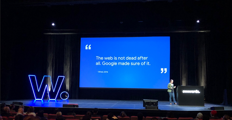 Jenny Gove von Google sprach über Progressive Web Apps. Diese haben durch Notifikationen, Servive Workers und lokalem Application Cache in Zukunft keine Nachteile mehr gegenüber nativen Apps.