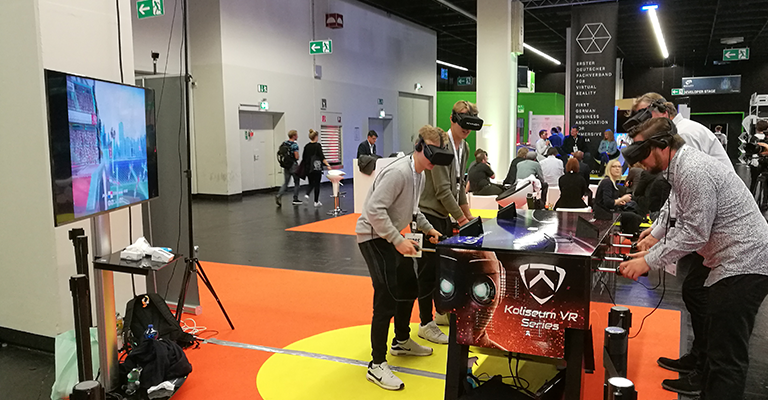 Für uns war es interessant zu sehen, wie viele VR Installationen in Kombination mit realer physischer Haptik arbeiteten, in dem man bspw. an einer Kletterwand eine VR-Brille und Sensorhandschuhe trug, um so das Klettern oder ein Kickertunier in der virtuellen Realität zu simulieren.