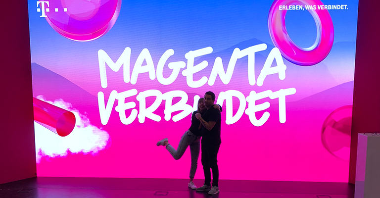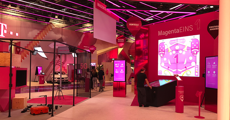 Den wohl auffälligsten Stand hatte die Deutsche Telekom unter dem Motto "Magenta Verbindet" aufgebaut. Der von der Kölner Agentur Meiré und Meiré designte Stand in Halle 21 erstrahlte auf rund 3000 Quadratmetern komplett in Magenta. Für uns die wohl wichtigsten Spots waren zuallererst das von uns eigens für den Stand entwickelte interaktive Telekom 5G Race, das auf einem sechs Meter hohen Screen kaum zu übersehen war. Und nicht zu vergessen das PINBALL Game: Ja, genau, wir haben den guten alten Flipper in digitaler Form für die Telekom wieder zum Leben erweckt und extra für das Event einen Tisch anfertigen lassen (seht ihr auf den Bildern). Ziel beider Installationen: Telekom Kunden oder denen, die es noch werden wollen, die Vorteile von 5G und MagentaEINS spielerisch und virtuell näher zu bringen.