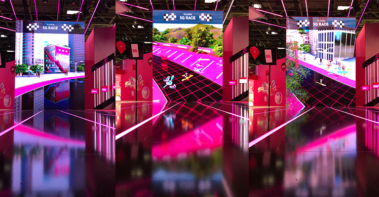 Unser für die Telekom entwickeltes 5G Race wurde auf einer 4x6 Meter großen LED-Wand gezeigt und war beim Betreten des Messestandes kaum zu übersehen. Es sollte den Besuchern die Vorteile und Inhalte des neuen, verbesserten und schnelleren Telekom-Netzes durch ein Rennen à la Mario Kart in einer zukünftigen Smart City näher bringen. Bis zu fünf Spieler konnten sich registrieren, um die so genannten Racer per Fernzugriff mit einem Smartphone als Controller auf dem Bildschirm zu steuern. Während des Spiels müssen verschiedene Hindernisse überwunden und Power-Ups in Form der wichtigsten 5G Vorteile eingesammelt werden, um sich so nach vorn zu spielen und den Wettbewerb zu gewinnen.