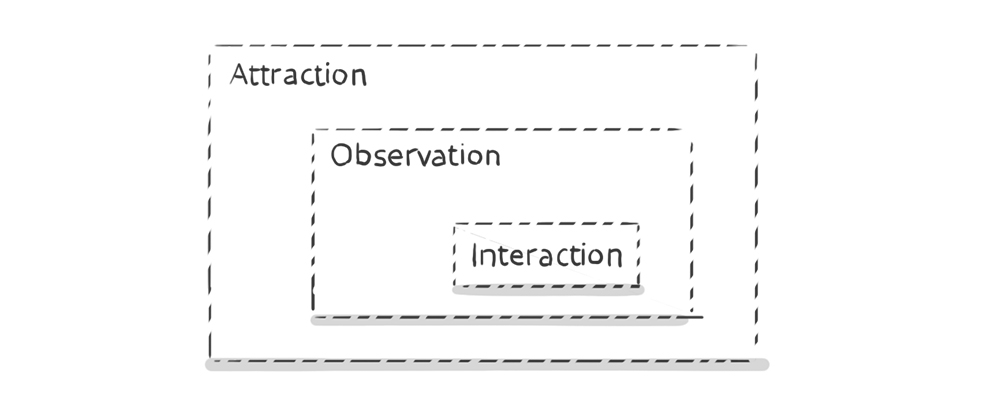 Dan Saffer schreibt in seinem Buch "Designing Gestural Interfaces, 2008", dass ein interaktiver Display drei Zonen des Engagements hat. Aus der Distanz sollte der Nutzer vom Angebot angezogen werden, also Attraction. In mittlerer Nähe wird vorerst passive Information vermittelt, also Observation. Im persönlichen Bereich offenbart sich die Interaktion.