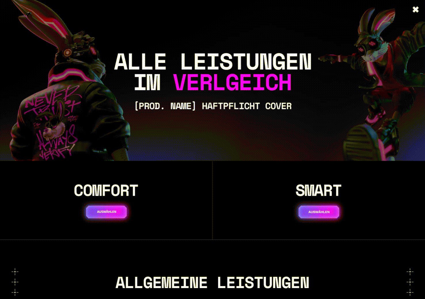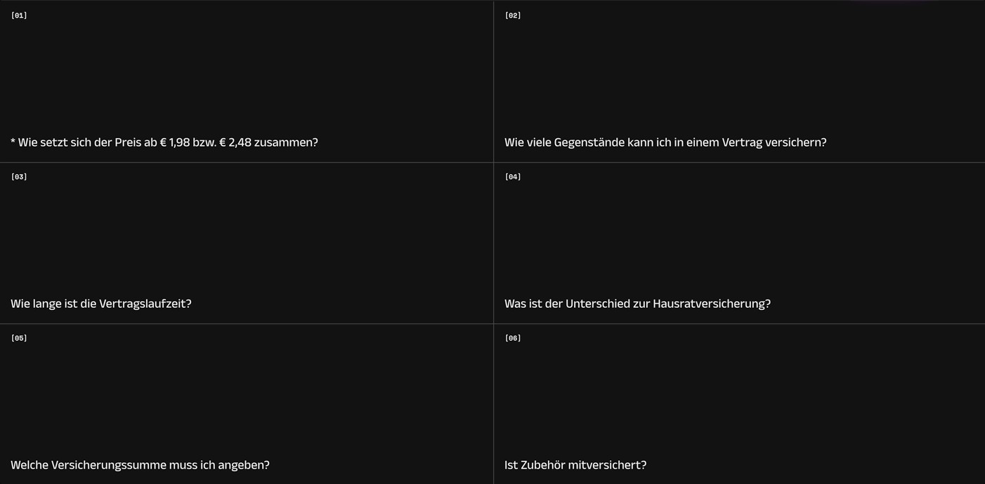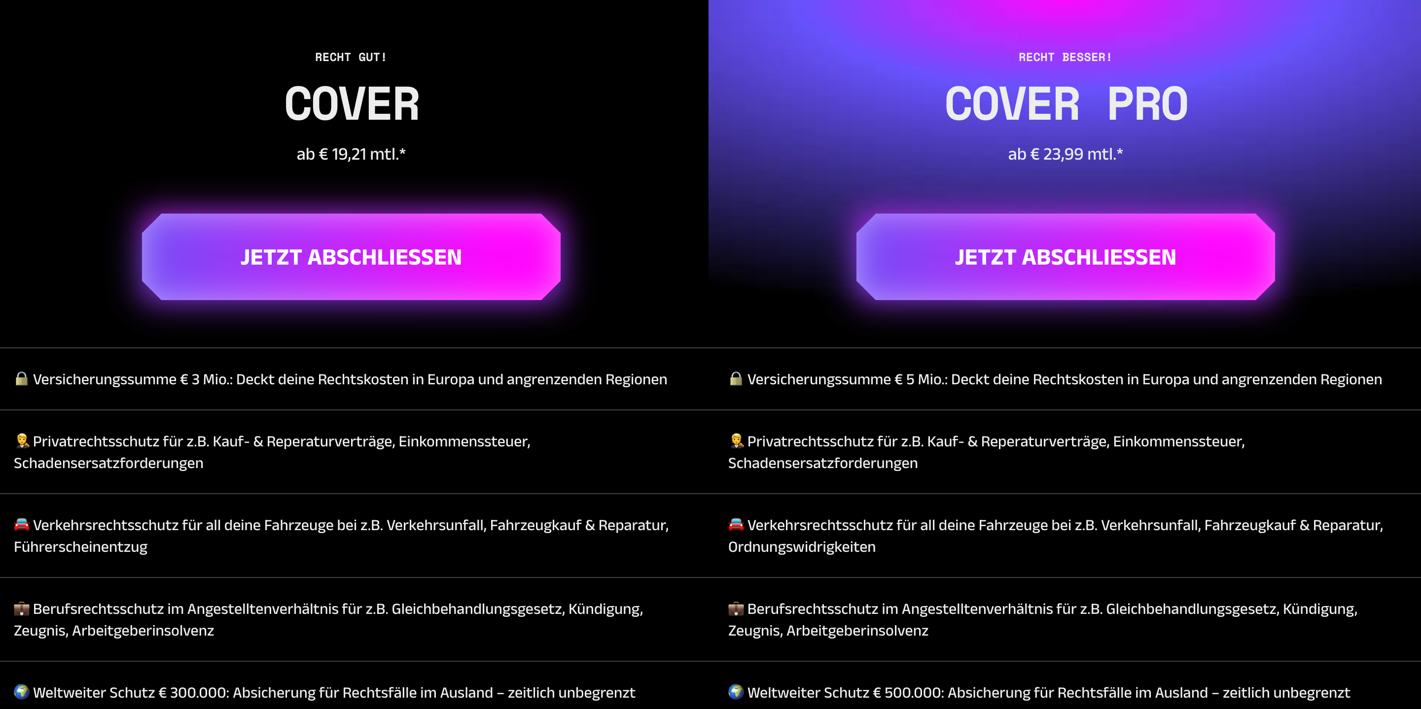 Drei Hero-Produkte – Virtual Cover, Creator Cover und Hardware Cover – erhalten eigene visuelle Setups. Auch klassische Versicherungen sind integriert, aber visuell neu gedacht.