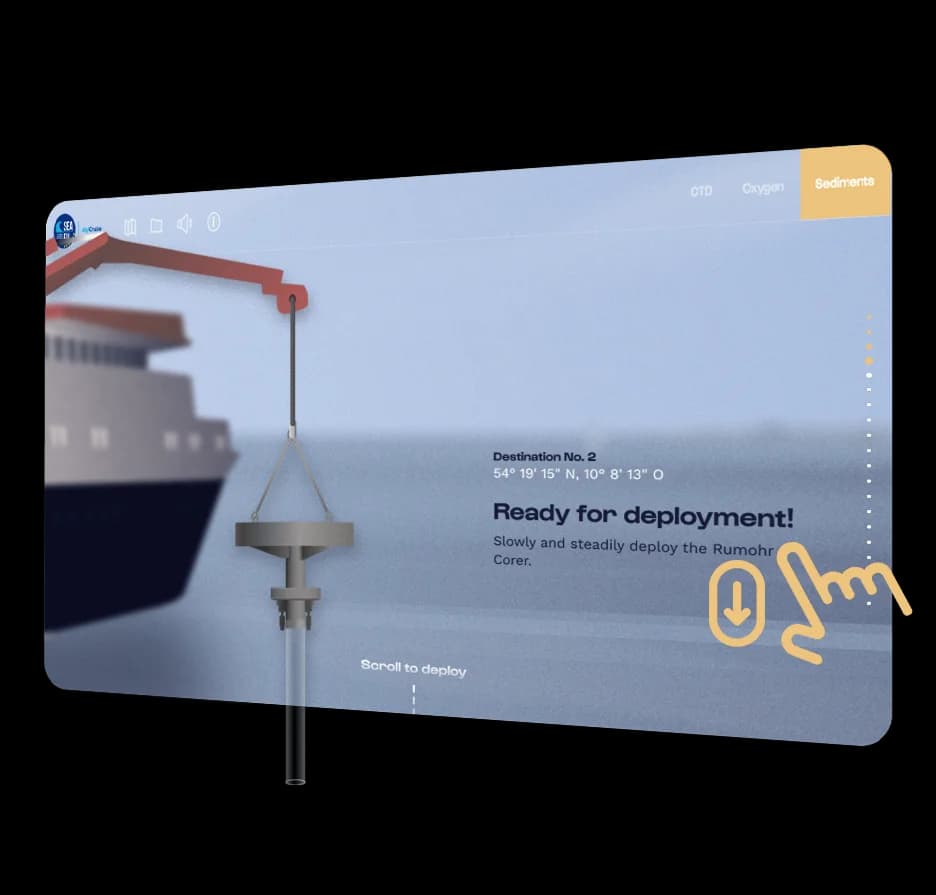 Das maßgeschneiderte Scroll-Framework setzt das Schiff in Bewegung und simuliert Probenentnahme sowie Messungen, sodass Studierende unter die Wasseroberfläche und in Datenzusammenhänge blicken können. Kontextsensitive Fragemodule geben unmittelbares Feedback; zwei charmante Ostseebewohner erklären richtige Lösungen mit einem Augenzwinkern.