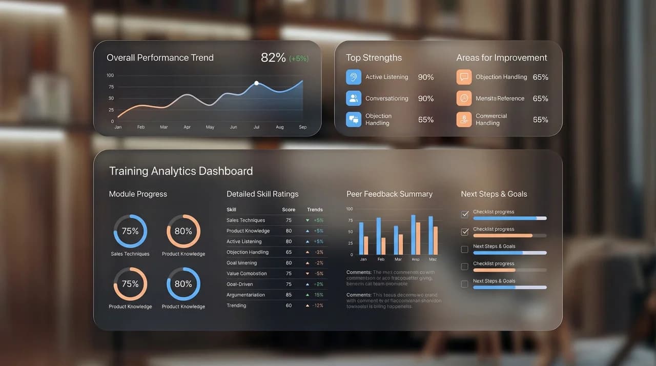 Ein integriertes Analytics-Dashboard zeigt Trainingsfortschritte, Gesprächsbewertungen und Kompetenzentwicklung auf individueller und Team-Ebene. Führungskräfte erkennen Stärken und Handlungsfelder auf einen Blick – datenbasiert statt bauchgesteuert.
