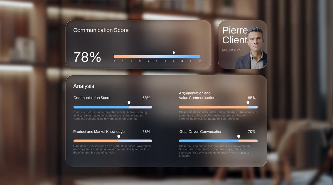 Nach jedem Gespräch erhalten Nutzer:innen detailliertes Feedback zu Gesprächsführung, Argumentation und Überzeugungskraft. Die KI analysiert Stärken und Schwächen und gibt konkrete Empfehlungen zur Verbesserung – personalisiert und datenbasiert.