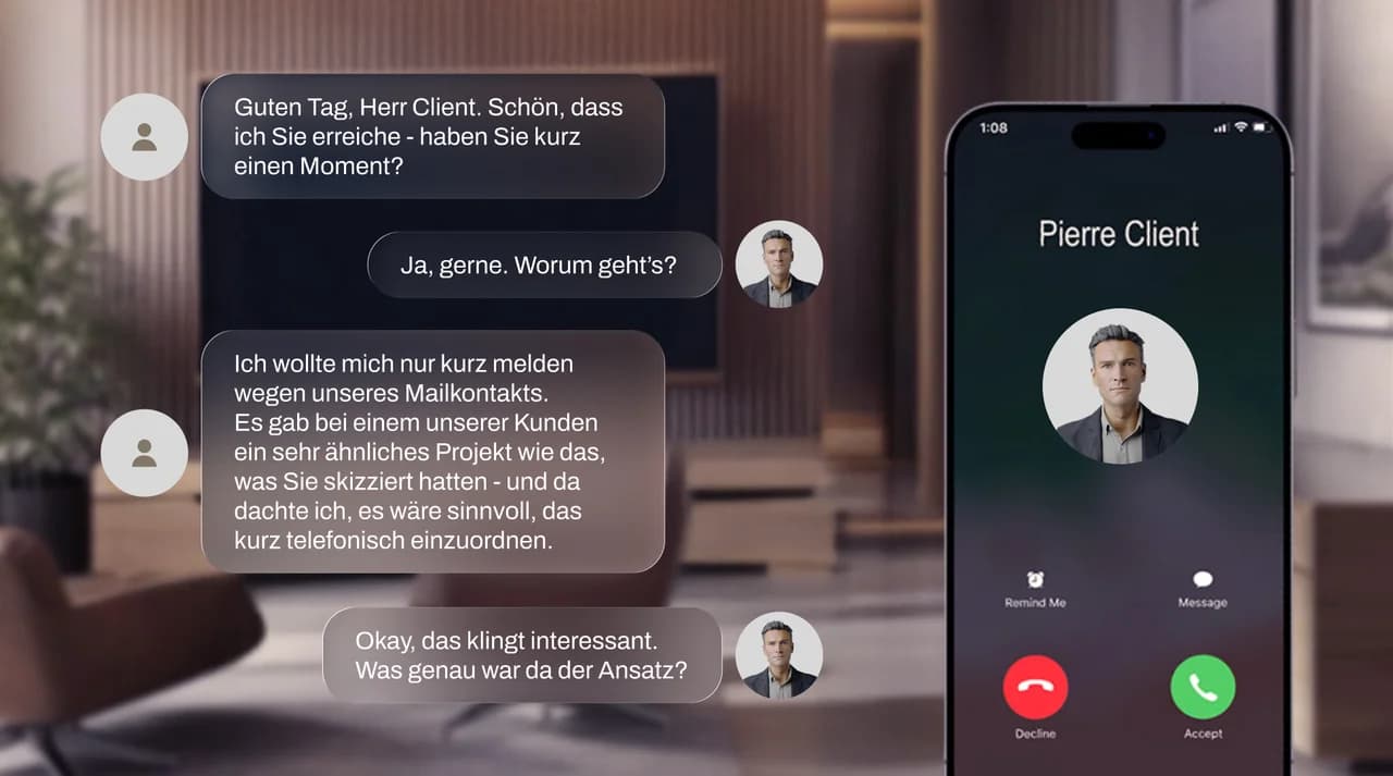 Vertriebsmitarbeitende trainieren Gespräche und E-Mails so oft wie nötig, erhalten direktes Feedback und verbessern sich kontinuierlich. Die Inhalte lassen sich flexibel an Produkte, Zielgruppen und Märkte anpassen. Das System ist auf allen gängigen Devices nutzbar – skalierbar, individuell und vollständig datenschutzkonform.