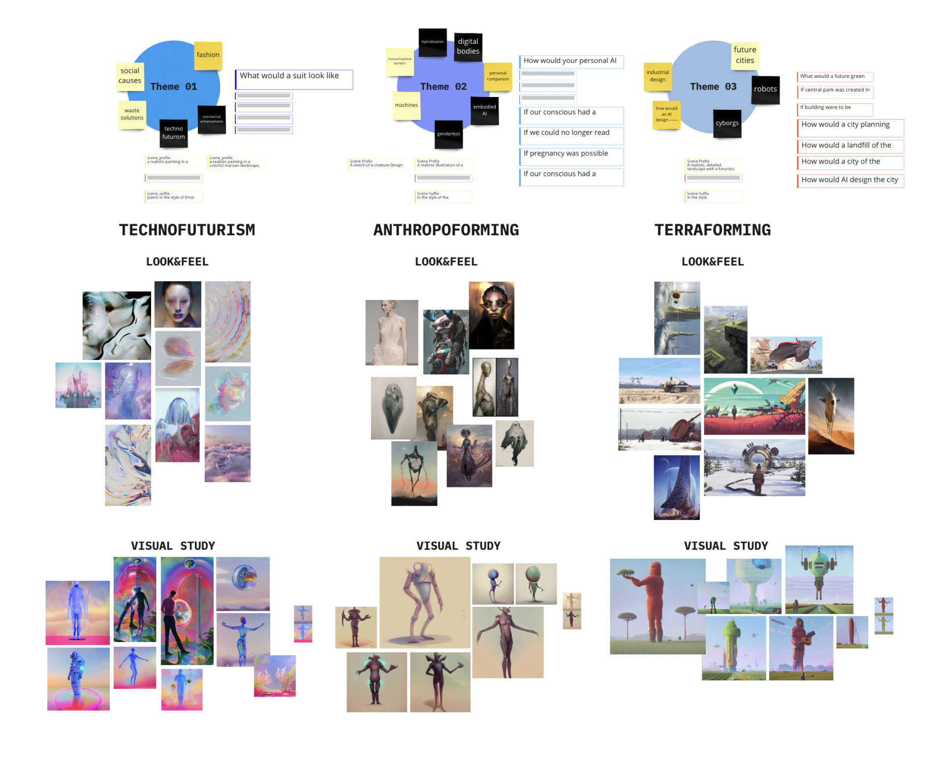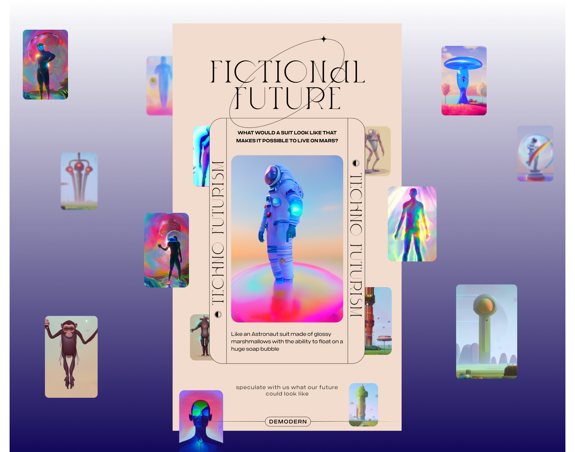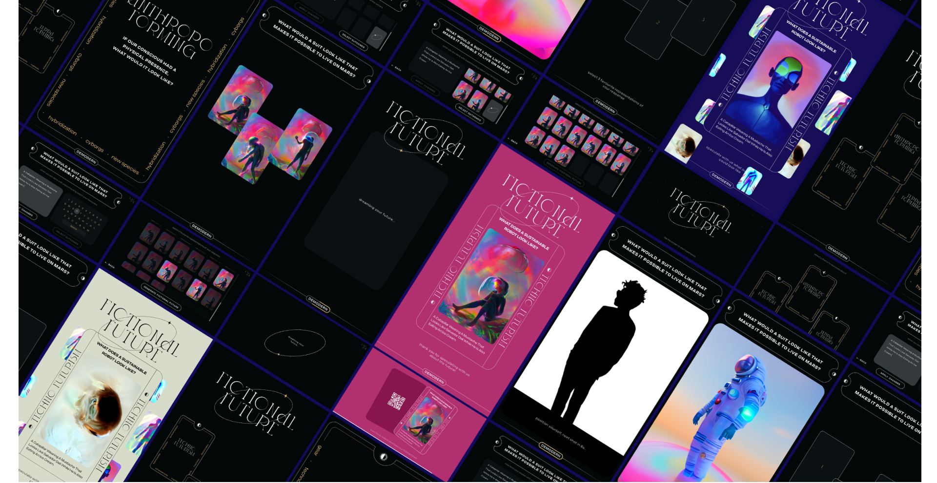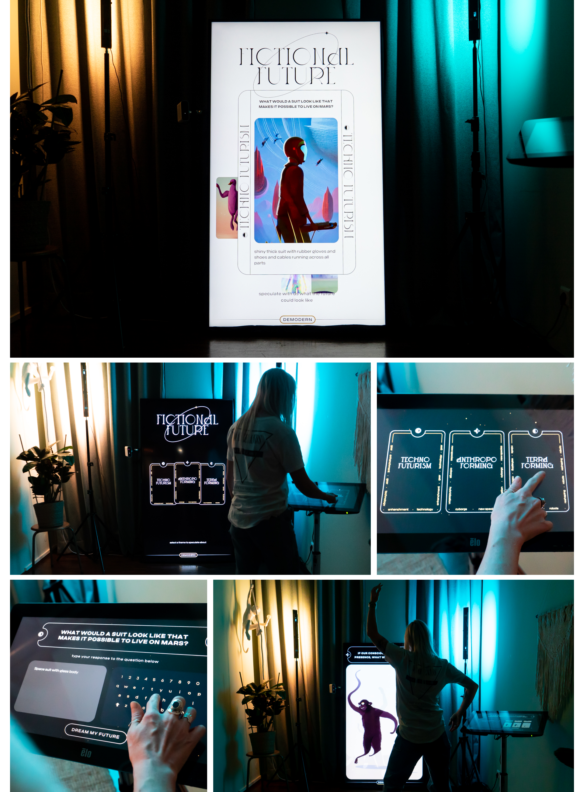 Als Deep-Learning-Generator entschieden wir uns für Stable-Diffusion, da es uns erlaubte, eine große Kontrolle über die Generierungsparameter zu haben. Anschließend haben wir einen konzeptionellen und visuellen Rahmen definiert, um den Benutzer und die Bildgenerierung zu einem zusammenhängenden Ergebnis zu führen. Die Hauptaufgabe bestand darin, Fragen über ein individuelles, spekulatives Zukunfts-Produkt zu beantworten und die Antwort über eine Touch-Pad einzugeben. Um die Nutzererfahrung zu optimieren, haben wir jedem Besucher dabei drei Dachthemen gegeben. Die Antwort des Users wurde dann als Text-zu-Bild-Prompt für die Bildgenerierung verwendet. Für jedes Dachthema haben wir eine individuelle visuelle Richtung entwickelt.