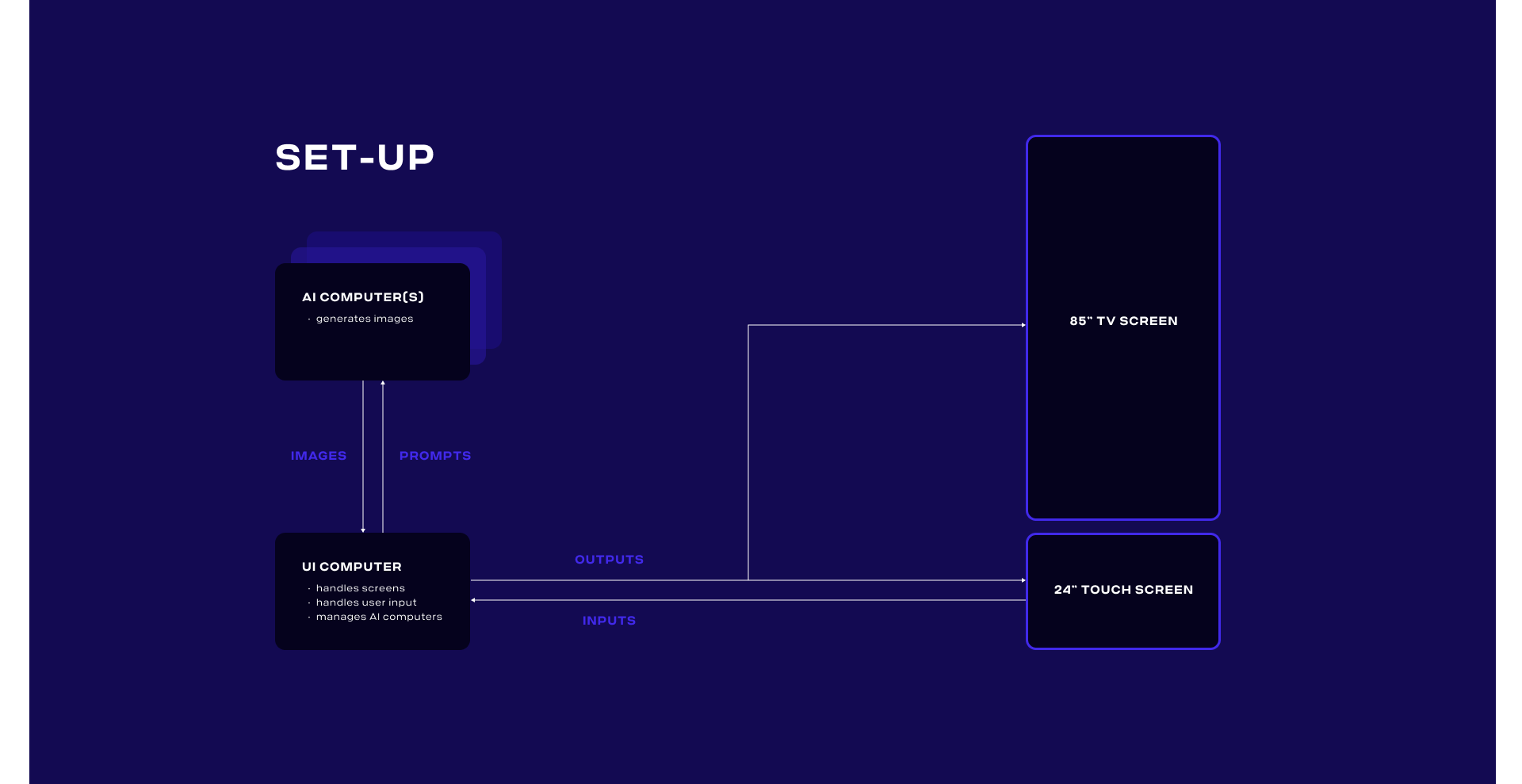 Das direkte Feedback an den User zu seinen/ihren Eingaben war ein entscheidender Aspekt der Experience. Daher haben wir die Bildgenerierung auf einen dedizierten High-End-PC aufgeteilt, auf dem eine selbstgehostete Stable Diffusion-Installation mit Einstellungen ausgeführt wurde. Dies ermöglichte uns, ein Bild innerhalb von 4-8 Sekunden zu rendern. Der User interagierte mit einem separaten Client, der die Benutzeroberfläche rendern und die Render-Anweisungen verwalten konnte. Durch Hinzufügen weiterer Render-PCs hätten wir die Bildwiederholrate sogar noch weiter erhöhen können.