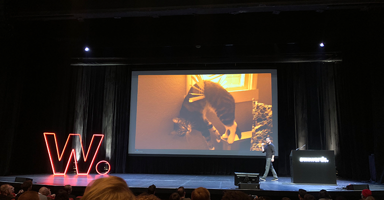 Tom Giannattasio von InVision sprach über Ergonomie bei der Entwicklung von Apps/Produkten. Ein Beispiel für eine schlechte Umsetzung sind die "Save-for-Web-Claws". Er eröffnete seinen Talk mit "Tiere sind dumm. Sie wissen nicht, wie man Werkzeuge benutzt." Daraufhin ist seine Präsentation drei Mal abgestürzt ...