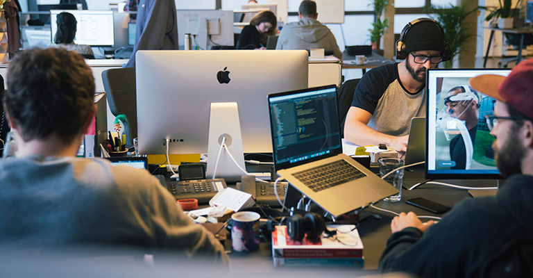 Neben den vier mit viel Liebe eingerichteten Meetingräumen, die zum kreativen Brainstorming oder Kundenmeetings einladen, haben wir ein offenes Büro, in dem die tägliche Arbeit stattfindet. Hier wird gecodet, designed, ux-ed... etc. etc.