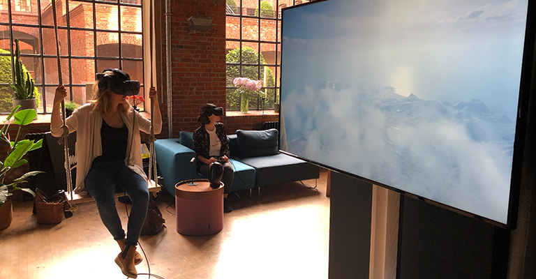Unsere VR Swing ist bereits über unsere Officegrenzen hinaus bekannt - sie hängt in unseren Büros und Besucher können seit jeher über Berlin, Hamburg oder Köln ihre Beine baumeln lassen. Für den Messeauftritt der Lufthansa auf der ITB haben wir diese immersive VR-Schaukel in Zusammenarbeit mit Kolle Rebbe noch erweitert und eine exklusive Virtual Reality Travel Experience entwickelt. Unsere Showroom- und auch die Messebesucher konnten bzw. können sich Wien, Kapstadt, New York oder San Francisco in Virtual Reality von oben anschauen. Einfach VR Brille aufsetzen, Destination auswählen und losschaukeln.
