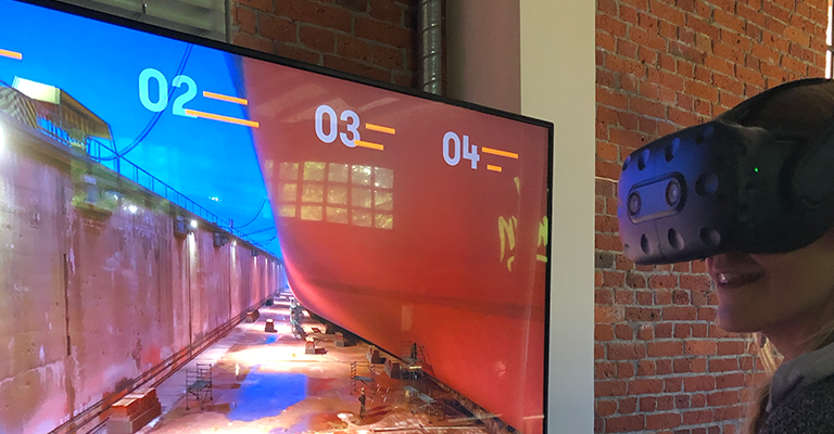 Bei uns im Showroom konnten die Besucher mit Hilfe von Virtual Reality in Europas größtem Trockendock ein riesiges Schiff samt riesiger Schiffschraube zur sogenannten "Blauen Stunde" betrachten und die Hebebühne dabei quasi selbst steuern. Für ein noch eindrucksvolleres und immersiveres Erlebnis spürt man die Auf- und Abwärstbewegungen deutlich.