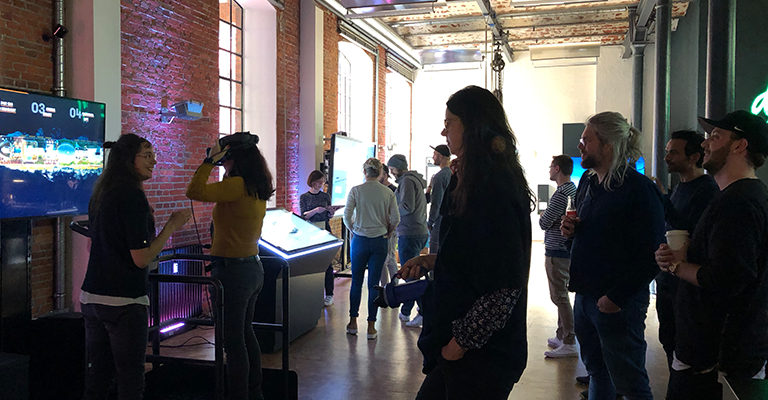 Bei unserem Showroom Event zeigen wir immer wieder innovative Technologien und kreative High-End-Lösungen zum Anfassen und Erleben. Unsere Besucher können sich von den neuesten Trends und Use Cases inspirieren lassen und sich mit unseren Experten in Konzept, Design und Entwicklung anschauen, wie wir Ideen und Technologien zum Leben erwecken. Dafür haben wir unsere geliebte Werkhalle auf dem Hamburger Schulterblatt in einen Micro-Amusement Park verwandelt. Groß (und auch Klein) kam vorbei und konnte bzw. kann auch immer noch in Virtual Reality über den Wolken verschiedener Städte schweben, den IKEA Showroom in Realtime-VR oder das Traumauto am smart Cities Retail Table konfigurieren, nach Lust und Laune digital flippern, einen kleinen Taucher durch eine virtuelle Unterwasserwelt schwimmen lassen oder einen Sneak Peak ins Discovery Dock bekommen. Ganz exklusiv konnten unsere Besucher nämlich bereits vor der offiziellen Eröffnung der Mixed-Reality Welt zwei der Exponate kennen lernen und ausprobieren.