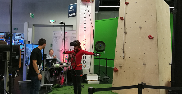 Für uns war es interessant zu sehen, wie viele VR Installationen in Kombination mit realer physischer Haptik arbeiteten, in dem man bspw. an einer Kletterwand eine VR-Brille und Sensorhandschuhe trug, um so das Klettern oder ein Kickertunier in der virtuellen Realität zu simulieren.