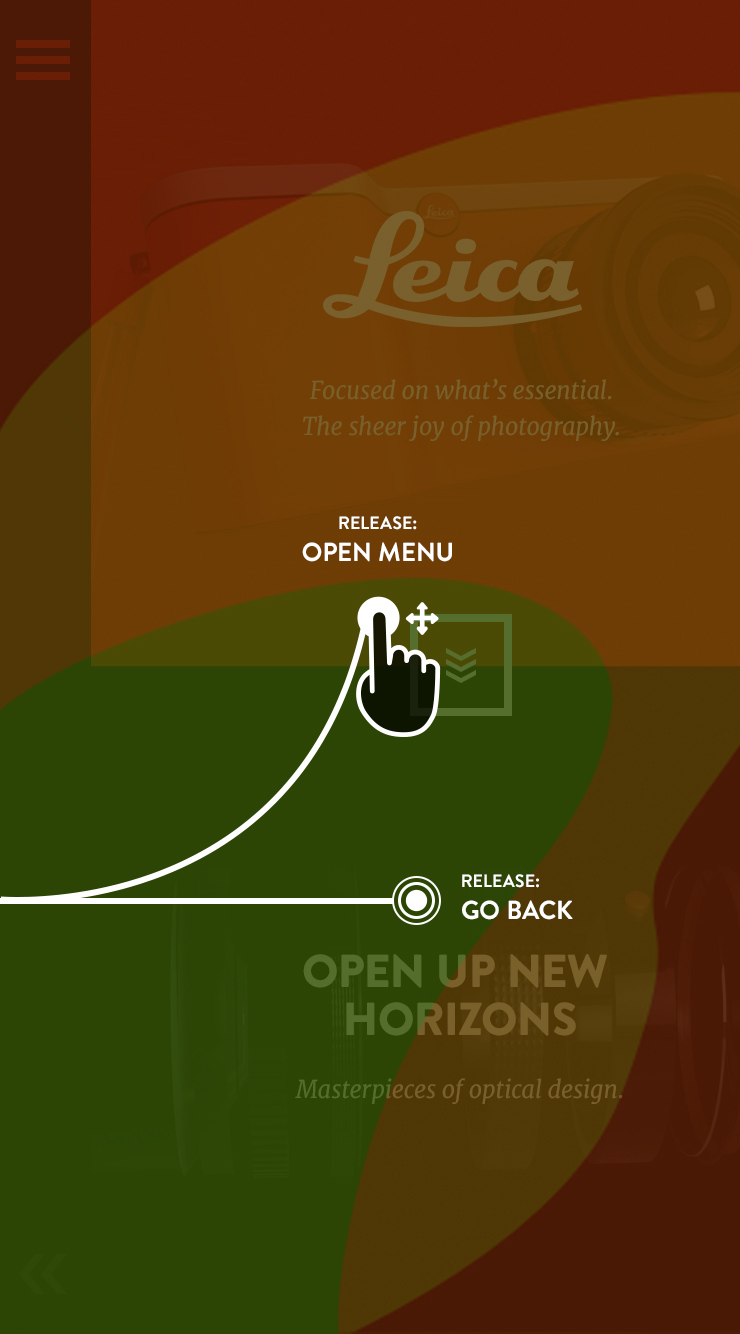Die Voraussetzung hier für ist, dass jeder Bildschirm in verschiedene Interaktionsbereiche gegliedert ist. Abhängig davon, an welcher Position die Swipe-Bewegung endet, wird eine Handlung ausgeführt. In diesem Beispiel wären es "Menü" und "Zurück". Das mögliche Ziel wird dann während der Interaktion, mittels einer kurzen UI-Animation, angezeigt.