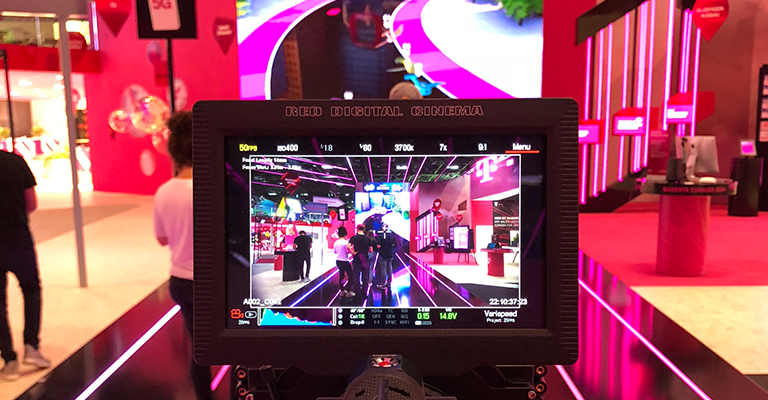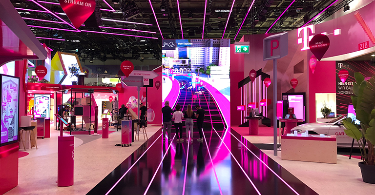 Den wohl auffälligsten Stand hatte die Deutsche Telekom unter dem Motto "Magenta Verbindet" aufgebaut. Der von der Kölner Agentur Meiré und Meiré designte Stand in Halle 21 erstrahlte auf rund 3000 Quadratmetern komplett in Magenta. Für uns die wohl wichtigsten Spots waren zuallererst das von uns eigens für den Stand entwickelte interaktive Telekom 5G Race, das auf einem sechs Meter hohen Screen kaum zu übersehen war. Und nicht zu vergessen das PINBALL Game: Ja, genau, wir haben den guten alten Flipper in digitaler Form für die Telekom wieder zum Leben erweckt und extra für das Event einen Tisch anfertigen lassen (seht ihr auf den Bildern). Ziel beider Installationen: Telekom Kunden oder denen, die es noch werden wollen, die Vorteile von 5G und MagentaEINS spielerisch und virtuell näher zu bringen.