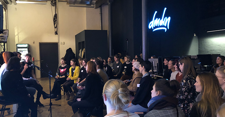 Der Abend startete mit einer Podiumsdiskussion zwischen Liane, Creative Strategy/DACH Lead bei Snapchat (seit wenigen Monaten Mutter, hatte kurz vergessen, dass sie verheiratet ist), Toni, Lead Designer bei myTaxi (eigentlich Antonia, denkt aber immer, sie habe etwas falsch gemacht, sobald sie mit ihrem vollen Namen angesprochen wird), Nora, Designer bei IBM iX (ganz frisch in Hamburg), und nicht zu vergessen unsere Hannah, Experience Director bei Demodern und Host des Panels (seit sechs Monaten bei uns an Bord). Allen vier gemein ist eine mehr oder weniger lange Vergangenheit in der Werbe- und Digitalindustrie, sie haben ganz eigene Erfahrungen mit Sexismus, Diversity und Erfolg oder auch Erfolgsdruck im Job gemacht. Seien es nun sexistisch anmutende Tweets, die wieder gelöscht wurden, Diversity Fortbildungen, die jeder Angestellte mitmachen muss oder „sich dem System unterordnen“ müssen – frei nach dem Motto: „wenn ich das Spiel mitspiele, passiert mir auch nichts. Ist aber schon besser, wenn du keinen Lippenstift oder kurze Röcke trägst, Süße…“