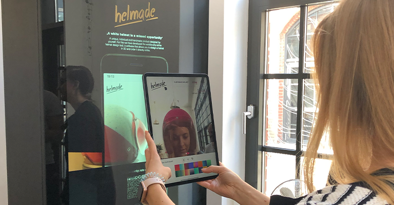 Das Highlight war mit Sicherheit die Hypebox für helmade. In die Box wurde ein physischer Helm platziert, den wir darüber hinaus in 3D nachgebaut und animiert haben. Mit Unity wurde das 3D Modell quasi zum Leben erweckt, so dass Nutzer den Helm in der Hypebox scannen können, dieser erscheint dann auf dem dafür verwendeten iPad. Mit Hilfe von Augmented Reality kann der Nutzer genau diesen Helm aufsetzen, um dann die Farbe anzupassen und zu schauen, ob er passt. Und das ganz ohne, dass der Nutzer ihn in Wirklichkeit aufsetzen und sich bereits beim Ausprobieren die Frisur ruinieren muss. Für uns eine Revolution für den Einzelhandel.