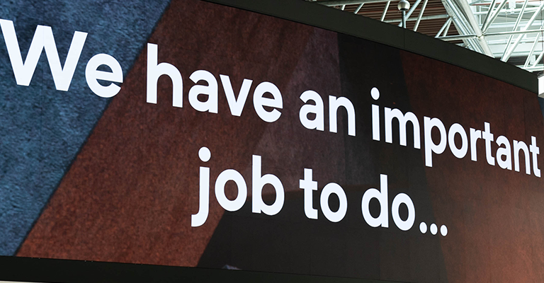 Für eine 26 Meter x 2,5 Meter große, gebogene LED-Wand mit 10386 Pixel Breite und 960 Pixel Höhe haben wir 3D gerenderte Inhalte und Videoinhalte auf Basis des Materials erstellt, das RHI Magnesita uns zur Verfügung gestellt hat und so für alle Messebesucher sichtbar gemacht. Darüber hinaus wurden im VIP-Bereich auf einer 2,5 Meter x 2,5 Meter großen Wall Kernbotschaften und Markenansprüche transportiert. Die geschwungene LED-Wand zeigte Image-Video und wichtige Slogans des Unternehmens, auf der kleineren wurden das Image-Video und der sogenannte "Brick-Timer" präsentiert.