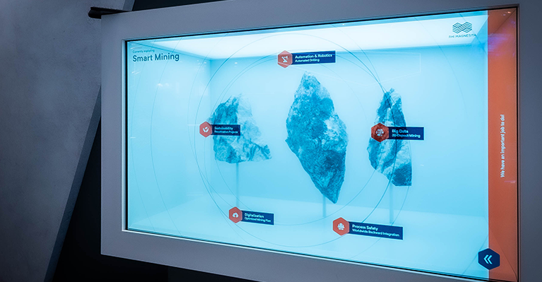 Nicht nur die wichtigsten feuerfesten Steine der Marke sollten physisch erlebbar gemacht werden, darüber hinaus wurden die Botschaften des Unternehmens auch digital transportiert. Zu diesem Zweck haben wir Hypeboxen mit auf RHI Magnesita zugeschnittenem UI & UX Design entwickelt, die den Lebenszyklus der Produkte interaktiv erlebbar machen sollten - vier davon waren am Stand verfügbar.